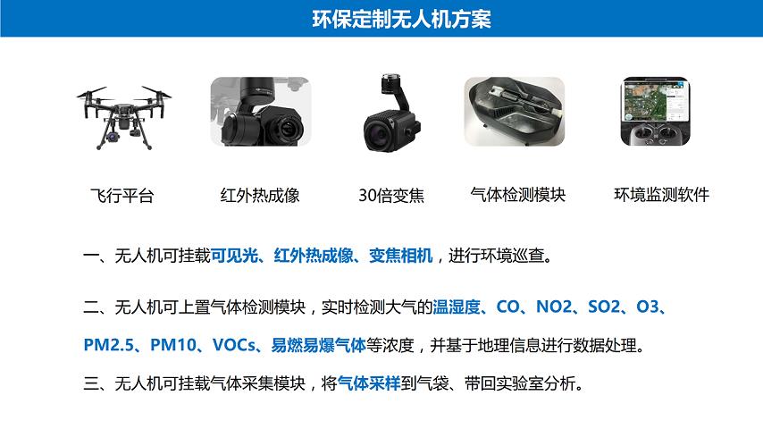 2. 国家很多大的污染源,像国控源、省控源有在线监管仪器监管。对于一些小的污染源,很难都装上在线检测仪器,而实际上对我们的环境影响是很大的,因为它的除污染水平比较低,它不像大电厂等除污措施比较完备、运行也比较稳定。因此,无人机航拍的方式是对监管的很好补充。